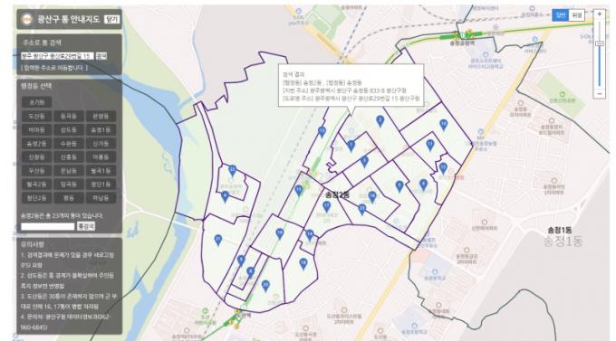 ±¤»ê±¸ Åë ¾È³»Áöµµ´Â ±¤»ê±¸ °ø°øµ¥ÀÌÅÍ Ç÷§Æû ±¤»êimap(imap.gwangsan.go.kr)¿¡¼ È®ÀÎÇÒ ¼ö ÀÖ´Ù. ¸Þ´º³ª ÁöµµÀÇ ÇàÁ¤µ¿ À̸§À» Ŭ¸¯Çϰųª ÇØ´ç ÁÖ¼Ò¸¦ ÀÔ·ÂÇϸé ÇàÁ¤µ¿, ¹ýÁ¤µ¿, Åë ¹øÈ£ µî ´Ù¾çÇÑ Á¤º¸¸¦ Á¦°øÇÑ´Ù.