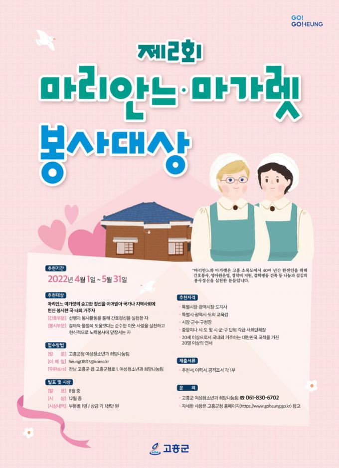 [È£³²´º½º¶óÀÎ = ¼ÀºÈ« ±âÀÚ] °íÈﱺ(±º¼ö ¼Û±Í±Ù)Àº ¸¶¸®¾È´À¿Í ¸¶°¡·¿ µÎ ºÐ °£È£»çÀÇ ¼þ°íÇϰí Çå½ÅÀûÀÎ ºÀ»çÁ¤½ÅÀ» ÀÕ´Â Á¦2ȸ ¸¶¸®¾È´À¤ý¸¶°¡·¿ ºÀ»ç´ë»ó Èĺ¸ÀÚ¸¦ Ãßõ °ø¸ðÇÑ´Ù. ¿À´Â 5¿ù 31ÀϱîÁö Èĺ¸ÀÚ ÃßõÀ» ¹Þ´Â ºÀ»ç´ë»óÀº °£È£ºÎ¹®°ú ºÀ»çºÎ¹®À¸·Î ³ª´©¾î °¢°¢ 1¸íÀ» ½Ã»óÇϸç, ½Ã»ó±ÝÀº ºÎ¹®º° 1õ¸¸¿øÀÌ´Ù.