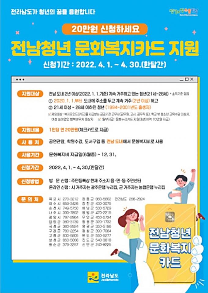 [È£³²´º½º¶óÀÎ = ¼ÀºÈ« ±âÀÚ] ³ªÁֽô Áö¿ª û³âÀÇ ¹®È¡¤¿©°¡È°µ¿ Áö¿øÀ» À§ÇÑ ¡®Àü³² û³â ¹®Èº¹ÁöÄ«µå¡¯ »ç¾÷ ½ÅûÀ» ¿À´Â 30ÀϱîÁö Á¢¼öÇÑ´Ù°í 14ÀÏ ¹àÇû´Ù.