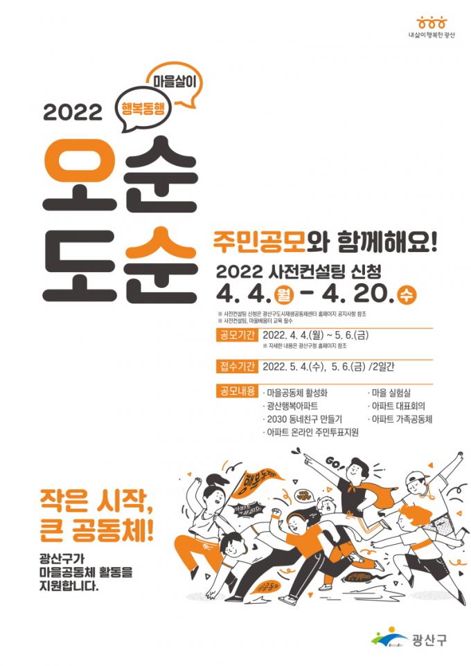 ÇÑÆí, ¡®2022³â ¿À¼øµµ¼ø ¸¶À»»ìÀÌ Çູµ¿Ç࡯ Áֹΰø¸ð °èȹ¼´Â 5¿ù4~6ÀÏ Á¢¼öÇϸç, ½ÅûÀ» Èñ¸ÁÇÏ´Â ÁֹΠ¸ðÀÓ, °øµ¿Ã¼ µîÀº ¸¶À»¹è¿òÅÍ ±³À°À» À̼öÇÑ µÚ »çÀüÄÁ¼³ÆÃÀ» °ÅÃÄ¾ß ÇÑ´Ù. ¸¶À»¹è¿òÅÍ ±³À°Àº ±¤»ê±¸, ±¤»ê±¸ µµ½ÃÀç»ý°øµ¿Ã¼¼¾ÅÍ À¯Æ©ºê ä³Î¿¡¼ ¼ö°ÇÒ ¼ö ÀÖ´Ù.