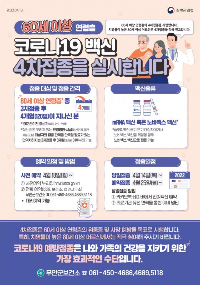 [È£³²´º½º¶óÀÎ = ¼ÀºÈ« ±âÀÚ] ¹«¾È±ºÀº 60¼¼ ÀÌ»ó(1962³â 12¿ù 31ÀÏ ÀÌÀü Ãâ»ýÀÚ) 3Â÷ Á¢Á¾ ÈÄ 4°³¿ù(120ÀÏ)ÀÌ Áö³ ¾î¸£½ÅµéÀ» ´ë»óÀ¸·Î 4Â÷ Á¢Á¾À» ½ÃÇàÇϰí ÀÖ´Ù°í ¹àÇû´Ù.