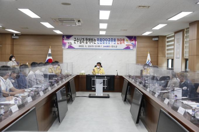 À̹ø °£´ãȸ´Â ´ë¹Î ÇàÁ¤¼ºñ½º¸¦ ó¸®ÇÏ´Â ¹Î¿ø´ã´ç °ø¹«¿øµéÀÇ °íÃæ°ú °ÇÀÇ»çÇ×, ¹Î¿ø Çö¾È¿¡ ´ëÇÑ ÀÚÀ¯·Î¿î ´ëÈÀÇ ÀåÀ» ¿±â À§ÇØ ¸¶·ÃµÈ ÀÚ¸®·Î À̵¿Áø Áøµµ±º¼ö¿Í ±ºÃ» ¹Î¿øºÀ»ç°ú, À¾․¸é ¹Î¿ø½Ç¿¡ ±Ù¹«ÇÏ´Â ¹Î¿ø´ã´ç °ø¹«¿ø 20¿©¸íÀÌ Âü¼®Çß´Ù.