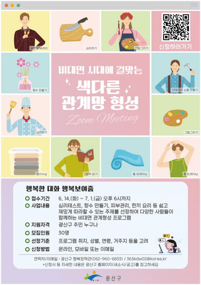 [È£³²´º½º¶óÀÎ = ¼ÀºÈ« ±âÀÚ] ±¤Áֽà ±¤»ê±¸°¡ °æÇè, »ý°¢, °¨Á¤À» ³ª´ ¼ö ÀÖ´Â °ü°è Çü¼º ÇÁ·Î±×·¥ ¡®ÇູÇÑ ´ëÈ, Çູº¸¿©ÁÜ(Zoom)¡¯ Âü¿©ÀÚ¸¦ ¸ðÁýÇÑ´Ù.