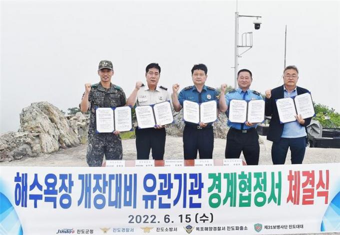 Á¦31º¸º´»ç´Ü Áøµµ´ë´ë, ¹Î¡¤°ü¡¤±º¡¤°æ¡¤¼Ò¹æ °æ°èÇùÁ¤¼ ü°á(ÁÂÃøºÎÅÍ) ¿À°æÅà Áøµµ´ë´ëÀå, ±èÆòÁ¾ Áøµµ¼Ò¹æ¼ ´ëÀÀ±¸Á¶°úÀå, ¼ÛµÎ¹é Áøµµ°æÂû¼ »ýȰ¾ÈÀü°èÀå, ½Å±æÈ£ ¸ñÆ÷ÇØ¾ç°æÂû¼ ÁøµµÆÄÃâ¼ÒÀå, ÀÌÁ¾È£ Áøµµ±ºÃ» ¾ÈÀüÃѰýÆÀÀåÀÌ ·¹ÀÌ´õ ±âÁö¿¡¼ °æ°èÇùÁ¤¼¸¦ ü°áÇÏ°í ÆÄÀÌÆÃ Æ÷Á ÃëÇϰí ÀÖ´Ù.
