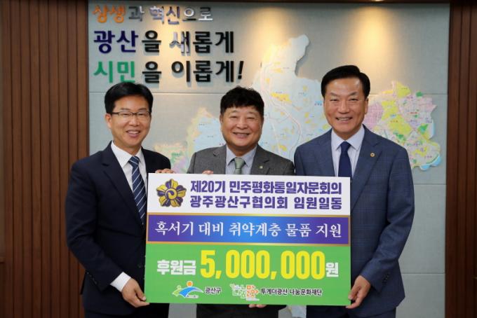 [È£³²´º½º¶óÀÎ = ¼ÀºÈ« ±âÀÚ] ¹ÎÁÖÆòÈÅëÀÏÀÚ¹®È¸ÀÇ ±¤ÁÖ±¤»ê±¸ÇùÀÇȸ(ȸÀå ±è½Â¾ð)°¡ 12ÀÏ ¿ÀÀü ±¤»ê±¸Ã»¿¡¼ Àü´Þ½ÄÀ» °®°í, ±¤»ê±¸ °ü³» Ãë¾à°èÃþÀÇ °Ç°ÇÑ ¿©¸§³ª±â¸¦ Áö¿øÇϱâ À§ÇØ 500¸¸ ¿øÀ» Åõ°Ô´õ±¤»ê ³ª´®¹®ÈÀç´Ü¿¡ ±âŹÇß´Ù.