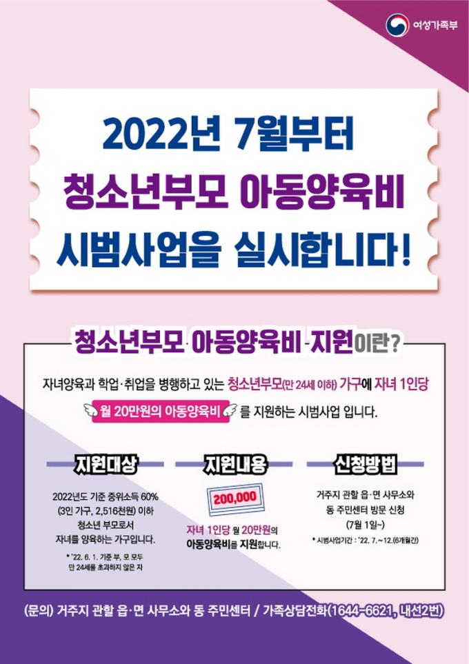 û¼Ò³âºÎ¸ð ¾Æµ¿¾çÀ°ºñ Áö¿ø»ç¾÷Àº û¼Ò³âºÎ¸ð·Î½á È¥ÀÎ °ü°è(»ç½ÇÈ¥ Æ÷ÇÔ)¸¦ À¯ÁöÇÏ¸ç ½ÇÁ¦·Î Àڳฦ ¾çÀ°Çϰí Àִ û¼Ò³âºÎ¸ð °¡±¸°¡ ÇØ´çÇϸç û¼Ò³âºÎ¸ðÀÇ ½ÅûÀ» ¹Þ¾Æ 7¿ùºÎÅÍ 12¿ù±îÁö 6°³¿ù°£ ÇѽÃÀûÀ¸·Î ¿î¿µµÈ´Ù. ´Ù¸¸ ÇѺθð°¡Á·Áö¿ø¹ý¿¡ µû¶ó º¹Áö±Þ¿©¸¦ ¹Þ´Â ÇѺθð°¡Á¤ ´ë»óÀÚ´Â Á¦¿ÜµÈ´Ù.