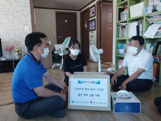 [È£³²´º½º¶óÀÎ = ¼ÀºÈ« ±âÀÚ] ÀåÈﱺ ¾È¾ç¸é Áö¿ª»çȸº¸ÀåÇùÀÇü(À§¿øÀå À±¾çÇö¡¤±è¿µÁß)¿¡¼´Â 26ÀÏ Ãâ»êÀÇ ±â»ÝÀ» ÇÔ²² ³ª´©±â À§ÇØ Ãâ»ê°¡Á¤À» ¹æ¹®ÇØ ÃàÇÏ ¼±¹°(±âÀú±Í, ¹°Æ¼½´ µî)À» Àü´ÞÇß´Ù.