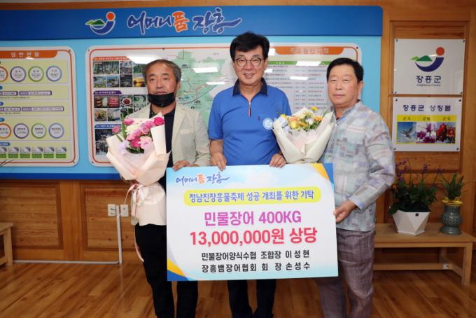 [È£³²´º½º¶óÀÎ = ¼ÀºÈ« ±âÀÚ] ÀåÈﱺÀº Á¦15ȸ Á¤³²Áø ÀåÈï ¹°ÃàÁ¦ÀÇ ¼º°ø °³ÃÖ¸¦ À§ÇØ ¹°°í±â Àâ±â üÇèÀå¿¡ ¹Î¹°Àå¾î¾ç½Ä¼öÇù(Á¶ÇÕÀå À̼ºÇö)°ú ÀåÈï¹ìÀå¾îÇùȸ(ȸÀå ¼Õ¼º¼ö)ÀÌ ¹Î¹°Àå¾î 400kg(1300¸¸¿ø »ó´ç)À» ±âŹÇß´Ù°í ÀüÇß´Ù.