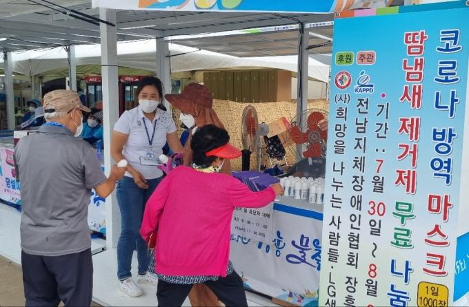 ¶ÇÇÑ ¸¶½ºÅ©¸¦ Âø¿ëÇÏÁö ¾Ê°í Çà»çÀåÀ» À̵¿ÇÏ´Â °ü±¤°´À̳ª Áֹε鿡°Ô´Â Á÷Á¢ ã¾Æ°¡ ¸¶½ºÅ©¸¦ ¹«·á·Î ¹èºÎÇÏ¿© È£ÀÀÀ» ¾ò¾ú´Ù. ÇÑ °ü±¤°´Àº ¡°Àü³²ÁöüÀå¾ÖÀÎÇùȸ ÀåÈﱺÁöȸÀÇ ¹«·á³ª´®°ú ºÀ»ç¿¡ ±íÀº °¨»ç¸¦ ÀüÇϸç, À̹ø ¹°ÃàÁ¦°¡ ¼º°øÀûÀ¸·Î ¸¶¹«¸®µÇ±æ Èñ¸ÁÇÑ´Ù¡±°í ¸»Çß´Ù.