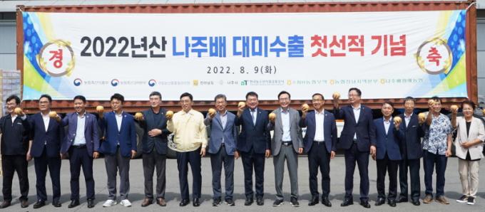 [È£³²´º½º¶óÀÎ = ¼ÀºÈ« ±âÀÚ] ¸íǰ °úÀÏ ¡®³ªÁÖ ¹è¡¯°¡ ¿ÃÇØ ù ¹Ì±¹ ¼öÃ⠱濡 ¿Ã¶ú´Ù. Àü±¹ ÃÖ´ë ¹è ÁÖ»êÁöÀÎ ³ªÁֽô 10ÀÏ ³ªÁÖ¹è¿ø¿¹³ó¾÷Çùµ¿Á¶ÇÕ°ú ÇÔ²² ¹Ì±¹À¸·Î ¼öÃâÇÏ´Â Á¶»ýÁ¾ ¹è »óÂ÷ Çà»ç¸¦ °³ÃÖÇß´Ù°í ¹àÇû´Ù.