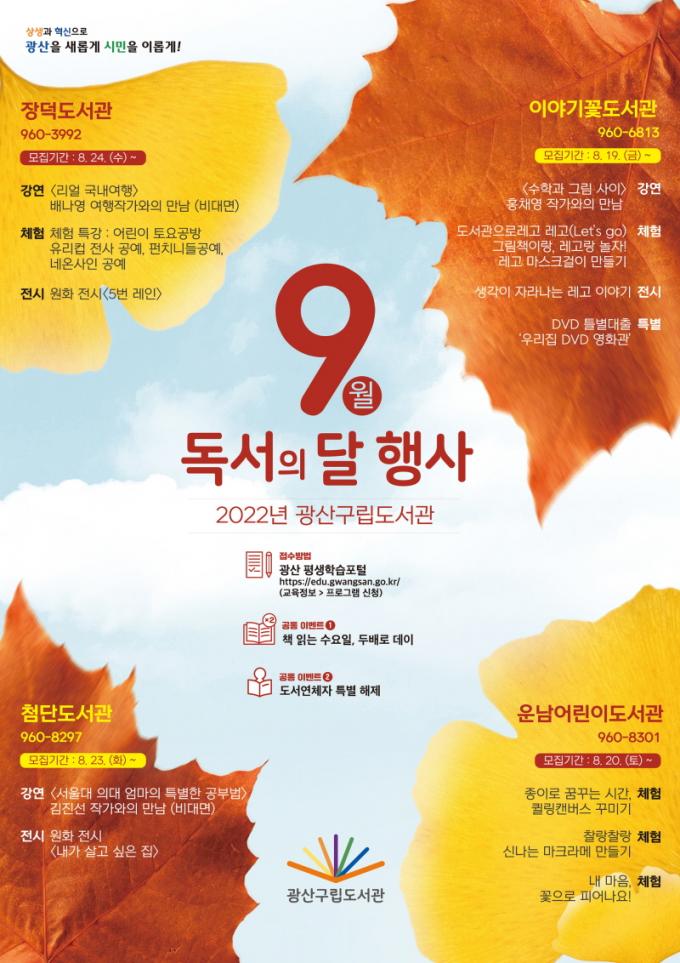 ±¤»ê±¸ µµ¼°ü °ü°èÀÚ´Â ¡°´Ù¾çÇÑ ÇÁ·Î±×·¥°ú À̺¥Æ®¸¦ ÅëÇØ ÁֹεéÀÌ µ¶¼¿¡ ´ëÇÑ °ü½ÉÀ» °®°í, µµ¼°üÀ» ã´Â ¹ß°ÉÀ½ÀÌ ÇѰá Áñ°Å¿öÁö±â¸¦ ¹Ù¶õ´Ù¡±°í ÀüÇß´Ù. 9¿ù µ¶¼ÀÇ ´Þ ÇÁ·Î±×·¥Àº ±¤»ê±¸ Æò»ýÇнÀÆ÷ÅÐ(edu.gwangsan.go.kr)¿¡¼ ½Åû °¡´ÉÇÏ´Ù.