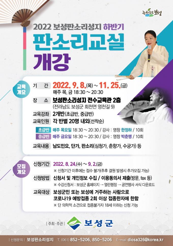 ÆÇ¼Ò¸®±³½ÇÀº 8¿ù 24ÀϺÎÅÍ 9¿ù 2ÀÏ ±Ý¿äÀÏ 18½Ã±îÁö ½Åû Á¢¼ö¸¦ ¹Þ´Â´Ù. ½Åû ¹æ¹ýÀº º¸¼º±º ȨÆäÀÌÁö – ¿¸°ÇàÁ¤ – °ø¿¬/Çà»ç¿¡¼ ¼½ÄÀ» ´Ù¿î¹Þ¾Æ º¸¼ºÆÇ¼Ò¸®¼ºÁö ¹æ¹® Á¢¼ö, Fax(061-850-5249) µîÀ¸·Î Âü°¡½Åû¼¿Í °³ÀÎÁ¤º¸ ¼öÁý¡¤À̿뵿ÀǼ¸¦ Á¦ÃâÇÏ¸é µÈ´Ù.