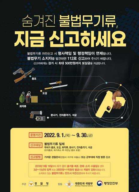 ºÒ¹ý¹«±â·ù¸¦ ¼ÒÁöÇϰí Àְųª ºÒ¹ý¹«±â ¹Ð°Å·¡ Á¶Á÷, ºÒ¹ý¹«±â ¼ÒÁöÀÚ ½Å°í ½Ã¿¡´Â ÃÖ´ë 500¸¸¿øÀÇ °Ë°Åº¸»ó±ÝÀ» Áö±ÞÇÒ ¹æÄ§ÀÌ´Ù. ¶ÇÇÑ, Àü³²°æÂûû °ü°èÀÚ´Â ¡°ÀÚÁø½Å°í ±â°£ Á¾·á ÈÄ 10¿ù ÇÑ ´Þ µ¿¾È Àü±¹ÀûÀ¸·Î ºÒ¹ý¹«±â·ù ÁýÁߴܼÓÀÌ ½Ç½Ã µÉ ¿¹Á¤ÀÌ´Ï ¼ÒÁöÇϰí ÀÖ´Â ºÒ¹ý¹«±â·ù´Â ¹Ýµå½Ã ÀÚÁø½Å°íÇϰí ÁÖº¯¿¡¼ ºÒ¹ý¹«±â·ù¸¦ ¼ÒÁöÇÑ »ç¶÷ ¹ß°ßÇÒ °æ¿ì 112³ª °æÂû°ü¼¿¡ ½Å°í ´çºÎµå¸°´Ù¡±°í Çß´Ù.