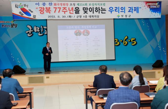 [È£³²´º½º¶óÀÎ = ¼ÀºÈ« ±âÀÚ] º¸¼º±ºÀº Áö³ 30ÀÏ ÀÌÁ¾Âù Àü(îñ) ±¹Á¤¿øÀåÀ» ÃÊûÇÏ¿© ¡®±¤º¹ 77ÁÖ³âÀ» ¸ÂÀÌÇÏ´Â ¿ì¸®ÀÇ °úÁ¦¡¯¸¦ ÁÖÁ¦·Î Á¦354ȸ º¸¼º ÀÚÄ¡Æ÷·³À» ÁøÇàÇß´Ù.