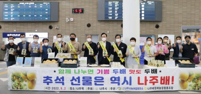 [È£³²´º½º¶óÀÎ = ¼ÀºÈ« ±âÀÚ] À±º´Å ³ªÁÖ½ÃÀåÀº 2ÀÏ ¿ÀÈÄ 4½ÃºÎÅÍ KTX³ªÁÖ¿ª¿¡¼ ÁøÇàµÈ ¡®³ªÁÖ ½ÅÈ¹è ÆÇ¸ÅÀü¡¯¿¡ Âü¿©ÇØ Ãß¼® ¼±¹°¿ë ³ªÁÖ¹è ½Åȸ¦ È«º¸Çß´Ù.