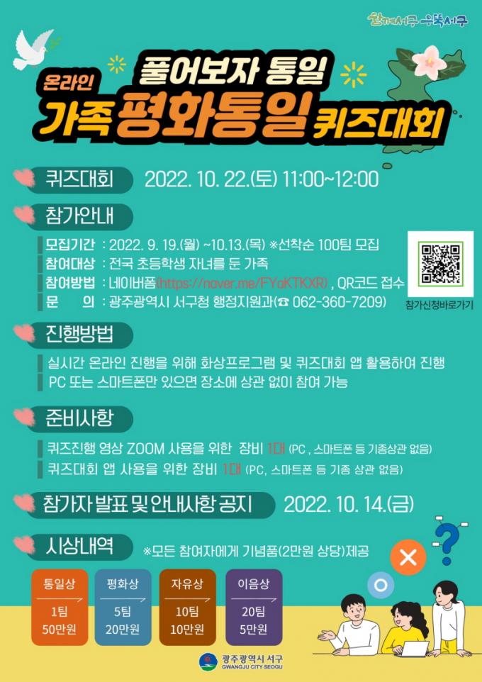 [È£³²´º½º¶óÀÎ = ¼ÀºÈ« ±âÀÚ] ±¤ÁÖ ¼±¸(±¸Ã»Àå ±èÀ̰)°¡ ¿À´Â 10¿ù 22ÀÏ, ÃʵîÇлý Àڳฦ µÐ °¡Á·À» ´ë»óÀ¸·Î ¡¸¡®Ç®¾îº¸ÀÚ, ÅëÀÏ¡¯ ¿Â¶óÀÎ °¡Á· ÆòÈÅëÀÏ ÄûÁî´ëȸ¡¹¸¦ °³ÃÖÇÑ´Ù.