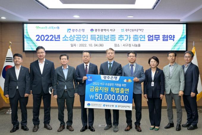 ¼±¸¿¡ µû¸£¸é ¿À´Ã(Áö³ 4ÀÏ) ±èÀ̰ ¼±¸Ã»Àå°ú ¼ÛÁ¾¿í ±¤ÁÖÀºÇàÀå, À̾ȹ¬ ±¤Áֽſ뺸ÁõÀç´Ü °æ¿µÁö¿øº»ºÎÀå µîÀÌ Âü¼®ÇÑ °¡¿îµ¥ ¡®¼Ò»ó°øÀΠƯ·Êº¸ÁõÀ» À§ÇÑ Ã⿬±Ý Ãß°¡Áö¿ø Çù¾à¡¯À» ü°áÇß´Ù.