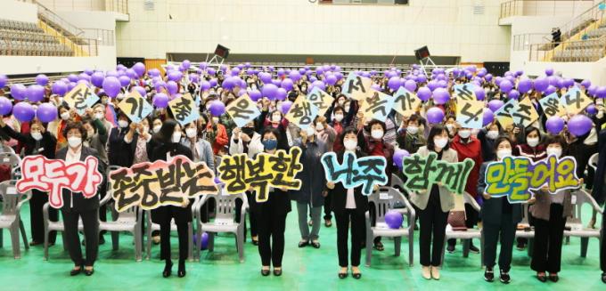 À±º´Å ½ÃÀå, ÀÌ»ó¸¸ ½ÃÀÇȸÀÇÀå, °ü°è ±â°ü¡¤´Üü, °¿¬¼÷ ¿©¼º´ÜüÇùÀÇȸÀåÀ» ºñ·ÔÇÑ °ü³» 21°³ ¿©¼º´Üü ȸ¿ø 500¿©¸íÀÌ Âü¼®ÇÑ °¡¿îµ¥ ¡®¸ðµÎ°¡ Á¸Áß¹Þ´Â ÇູÇÑ ³ªÁÖ ÇÔ²² ¸¸µé¾î¿ä¡¯¶ó´Â ½½·Î°Ç ¾Æ·¡ »óÈ£ ÈÇÕÀ» ´ÙÁ³´Ù.