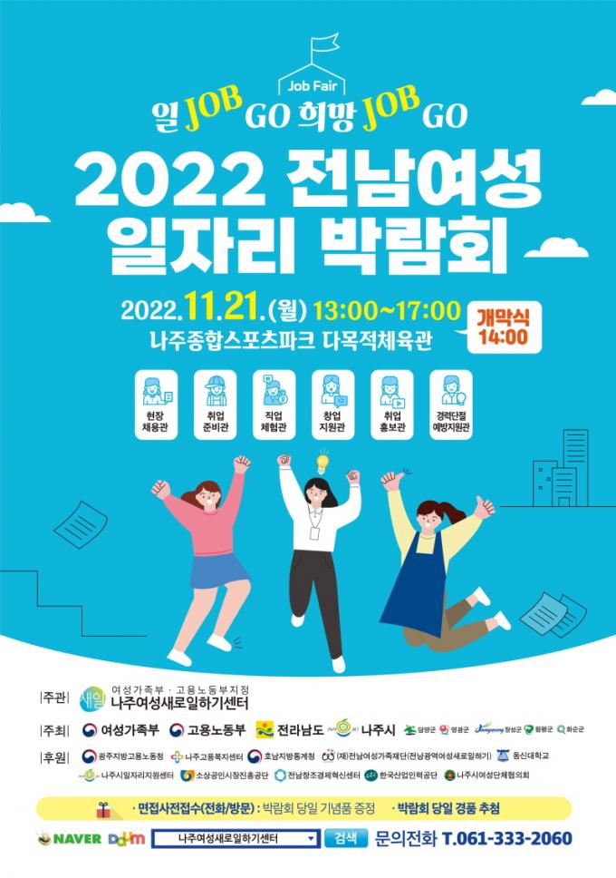 ³ªÁÖ½Ã(½ÃÀå À±º´ÅÂ)´Â ¿À´Â 21ÀÏ ³ªÁÖ½ºÆ÷Ã÷ÆÄÅ© ´Ù¸ñÀûüÀ°°ü¿¡¼ ¡®ÀÏ Àâ(JOB) °í(GO), Èñ¸Á Àâ(JOB) °í(GO)¡¯¶ó´Â ½½·Î°ÇÀ¸·Î 2022³â Àü¶ó³²µµ ¿©¼º ÀÏÀÚ¸®¹Ú¶÷ȸ¸¦ °³ÃÖÇÑ´Ù°í 16ÀÏ ¹àÇû´Ù.