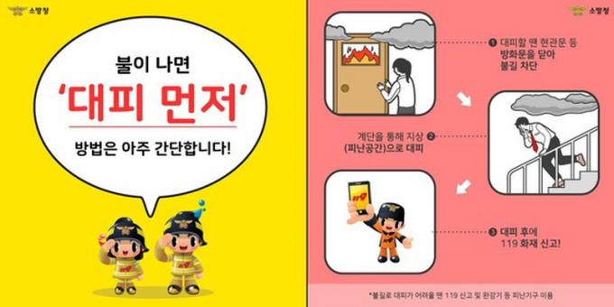 ÈÀç°¡ ¹ß»ýÇßÀ» ¶§´Â ½ÇÁ¦·Î ½Å¼ÓÇÑ ´ëÇǰ¡ Áß¿äÇÏ´Ù. »ýÁ¸À» À§ÇÏ¿© Á¥Àº ¼ö°Ç µîÀ¸·Î ÄÚ¿Í ÀÔÀ» ¸·°í ³·Àº ÀÚ¼¼·Î ¿Á»óÀ̳ª ¿ÜºÎ·Î À绡¸® ´ëÇÇÇØ¾ß ÇÑ´Ù.
