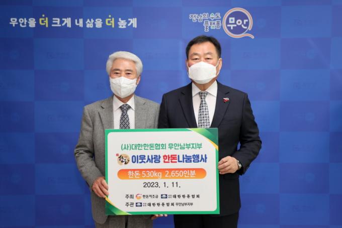 À̹ø Çà»ç´Â (»ç)´ëÇÑÇѵ·Çùȸ ¹«¾È³²ºÎÁöºÎ(ÁöºÎÀå ½Å±æ¿À) ȸ¿ø 20¿©¸íÀÌ Âü¿©ÇßÀ¸¸ç µ¶°Å³ëÀεé°ú ¼Ò¿Ü°èÃþÀÌ °Ç°ÇÑ °Ü¿ï³ª±â¿Í µû¶æÇÑ ¼³¸íÀý º¸³»±â¿¡ º¸ÅÆÀÌ µÇ°íÀÚ µÅÁö°í±â 440kg(530¸¸¿ø »ó´ç)À» ¹«¾È±º¿¡ Àü´ÞÇß´Ù.