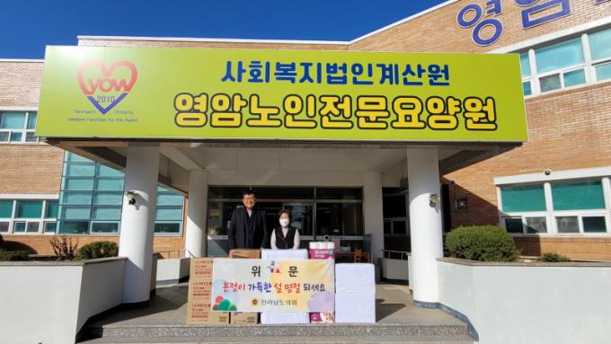 [È£³²´º½º¶óÀÎ = ¼ÀºÈ« ±âÀÚ] Àü¶ó³²µµÀÇȸ ½Å½Âö ÀÇ¿ø(´õºÒ¾î¹ÎÁÖ´ç, ¿µ¾Ï1)ÀÌ Áö³ 16ÀÏ ¼³ ¸íÀýÀ» ¸Â¾Æ ¿µ¾Ï±º¿¡ À§Ä¡ÇÑ ³ëÀκ¹Áö½Ã¼³ ¿µ¾Ï³ëÀÎÀü¹®¿ä¾ç¿ø°ú ¿µ¾ÏÈ¿¿ä¾ç¿øÀ» ¹æ¹®ÇØ À§¹®Ç°À» Àü´ÞÇß´Ù.