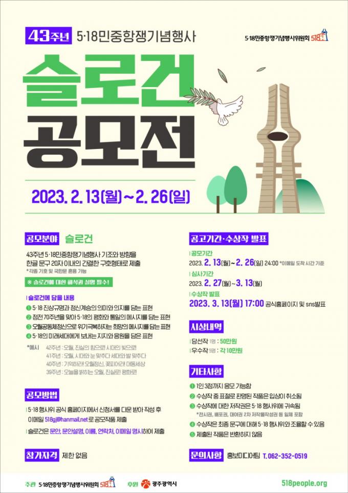 °ø¸ð´Â 1Àδç 3Á¡±îÁö Á¢¼öÇϰí, ¼ö»óÀÛÀº 3¿ù13ÀÏ 5¡¤18Çà»çÀ§ ȨÆäÀÌÁö(www.518people.org) °øÁö °Ô½ÃÆÇ¿¡ °Ô½ÃÇÑ´Ù. ¶ÇÇÑ, Ç¥¾î(½½·Î°Ç)°¡ È®Á¤µÈ ÈÄ 3¿ù14Àϲ² 5¡¤18 ±â³äÇà»çÀÇ ´ëÇ¥ Æ÷½ºÅ͸¦ Àü±¹ °ø¸ðÇÒ ¿¹Á¤ÀÌ´Ù.