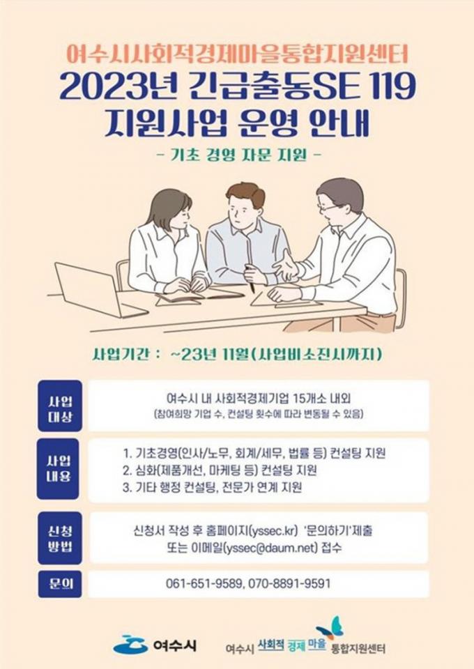 ±â¾÷Àº ¡ã¼¼¹«․ȸ°è ¡ãÀλç․³ë¹« ¡ã¹ý·ü․¹ý¹« ¡ã°æ¿µ․±ÝÀ¶ ¡ãÆÇ·Î(¸¶ÄÉÆÃ) µîÀÇ ÄÁ¼³ÆÃÀ» Á¦°ø¹Þ°Ô µÈ´Ù. »ç¾÷´ë»óÀº ¿©¼ö½Ã ¼ÒÀç (¿¹ºñ)»çȸÀû±â¾÷, (»çȸÀû)Çùµ¿Á¶ÇÕ, ¸¶À»±â¾÷ µî »çȸÀû°æÁ¦±â¾÷ÀÌ´Ù.