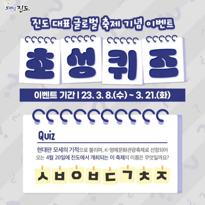 Ãʼº ÄûÁî´Â Çö´ëÆÇ ¸ð¼¼ÀÇ ±âÀûÀ¸·Î ºÒ¸®¸ç, K-¸í¿¹¹®È°ü±¤ÃàÁ¦·Î ¼±Á¤µÇ¾î ¿À´Â 4¿ù 20ÀϺÎÅÍ Áøµµ±º¿¡¼ °³ÃֵǴ ÃàÁ¦ÀÇ À̸§À» ¸ÂÃß¸é µÈ´Ù.