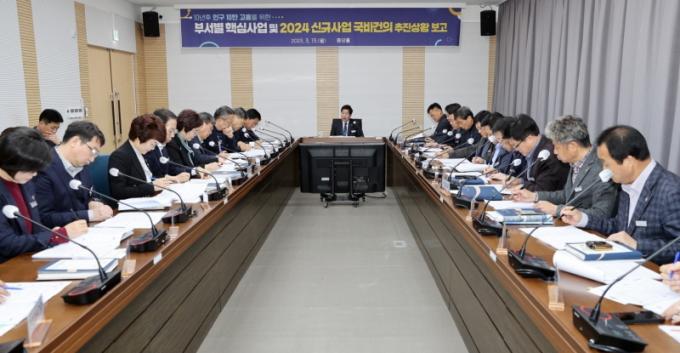 À̳¯ º¸°íȸ´Â °ø¿µ¹Î ±º¼ö¸¦ ºñ·ÔÇØ °£ºÎ °ø¹«¿ø 20¿© ¸íÀÌ Âü¼®ÇÑ °¡¿îµ¥ °¢ ºÎ¼º° ÁÖ¿ä Çٽɻç¾÷ ÃßÁøÇöȲ º¸°í¿Í ±¹¡¤µµºñ È®º¸ °ÇÀÇȰµ¿À» Á¡°ËÇÏ´Â ¹æ½ÄÀ¸·Î ÁøÇàµÆ´Ù.