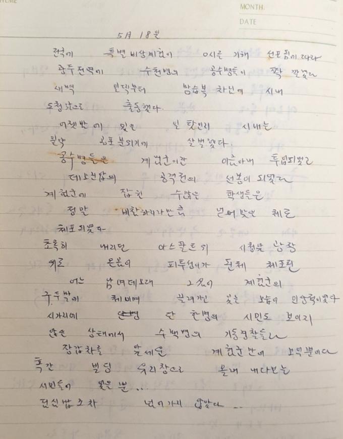 È«ÀÎÈ 5¡¤18¹ÎÁÖȿ±â·Ï°üÀåÀº ¡°ÀÌ ÀϱâÀåÀº 5¿ù ÇöÀå¿¡¼ °æÂûÀÌ ¾´ ±â·Ï¹°·Î¼ Àǹ̰¡ ±í´Ù¡±¸ç ¡°5¡¤18 ÇöÀå¿¡¼ Àü°æÀÇ ´«À¸·Î ÀÛ¼ºµÈ ¶Ç ÇϳªÀÇ ¿À¿ùÀϱⰡ 5¿ùÀÇ °¡Ä¡¸¦ ÀçÁ¶¸íÇÏ´Â Áß¿äÇÑ ÀÚ·á°¡ µÇ±æ ¹Ù¶õ´Ù¡±°í ¸»Çß´Ù. <³¡>
