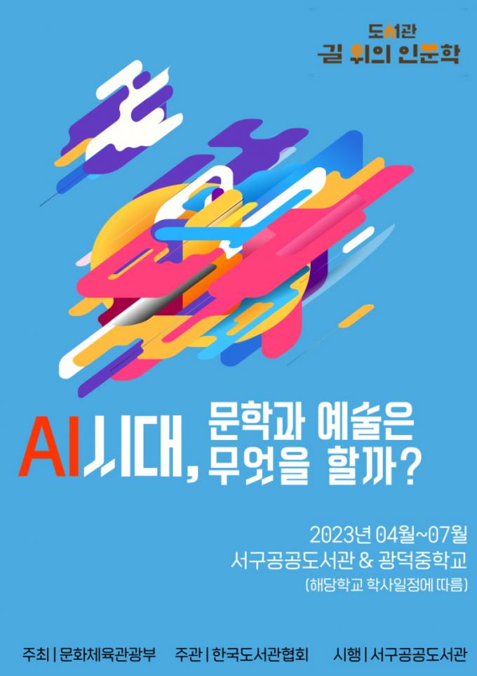 ¶ÇÇÑ, »çȸȮ»êÇü ¡°AI ½Ã´ë, ¹®Çаú ¿¹¼úÀº ¹«¾ùÀ» ÇÒ±î?¡±´Â ¼±¸ °ü³» ÁßÇб³ (±¤´öÁßÇб³, ´ëÀÚÁßÇб³) µÎ °³±³¿Í ¿¬°èÇÏ¿© ÃÑ 15ȸ¿¡ °ÉÃÄ ÁøÇàÇÑ´Ù. ÀÌ »ç¾÷Àº û¼Ò³â±â¿¡ ÇÊ¿äÇÑ Àΰ£À¸·Î¼ »îÀÇ º»Áú°ú »ç¶÷°ú »ç¶÷ »çÀÌÀÇ °ü°è µîÀ» ¹®Çаú ¿¹¼úÀ» ÅëÇØ ¾Ë¾Æº¸´Â ½Ã°£À¸·Î û¼Ò³âµé¿¡°Ô Àι®ÇÐ ¼Ò¾çÀ» ÁõÁøÇÏ´Â ±âȸ¸¦ Á¦°øÇϰíÀÚ ÇÑ´Ù.
