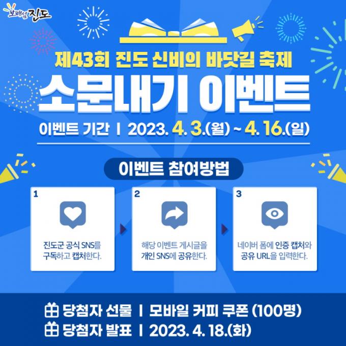 SNS ¼Ò¹®³»±â À̺¥Æ®´Â 4¿ù 20ÀϺÎÅÍ Áøµµ±º¿¡¼ °³ÃֵǴ Áøµµ ½ÅºñÀÇ ¹Ù´å±æ ÃàÁ¦ À̺¥Æ® °Ô½Ã±ÛÀ» °³ÀÎ SNS¿¡ °øÀ¯ÇÏ¸é µÈ´Ù.