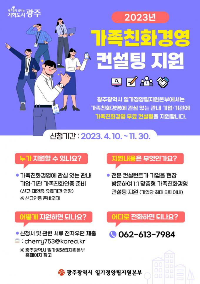 [È£³²´º½º¶óÀÎ = ¼ÀºÈ« ±âÀÚ] ±¤ÁÖ±¤¿ª½ÃÀϰ¡Á¤¾ç¸³Áö¿øº»ºÎ´Â Áö¿ª ±â¾÷¡¤±â°üÀÌ °¡Á·Ä£È°æ¿µÀ» µµÀÔÇϰí, ¡®°¡Á·Ä£ÈÀÎÁõ¡¯ ȹµæÀ» Áö¿øÇÏ´Â ¡®°¡Á·Ä£È°æ¿µÄÁ¼³ÆÃ¡¯ Âü¿© Èñ¸Á±â¾÷°ú ±â°üÀ» 10ÀϺÎÅÍ ¼±Âø¼øÀ¸·Î ¸ðÁýÇÑ´Ù.