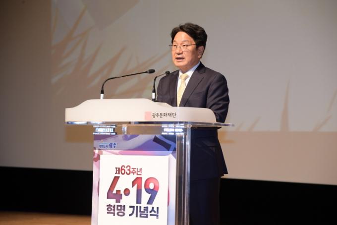 [È£³²´º½º¶óÀÎ = ¼ÀºÈ« ±âÀÚ] °±âÁ¤ ±¤ÁÖ±¤¿ª½ÃÀåÀº 19ÀÏ 4¡¤19Çõ¸í ±â³äÀÏÀ» ¸Â¾Æ ¡°4¡¤19Çõ¸íÀº ºÒÀÇ¿Í µ¶ÀçÀÇ Ä¥Èæ °°Àº ¾îµÒ ¼Ó¿¡¼µµ ¸¶Ä§³» ¹ÎÁÖÁÖÀǸ¦ ÁöÄѳ½ ½Â¸®ÀÇ ¿ª»ç¡±¶ó¸ç ¡°¿ì¸®´Â ¹ÎÁÖ¼±¿µéÀÇ Á¤½ÅÀ» µÇ»õ±â°í ¿À´Ã¿¡ µÇ»ì·Á ´ÙÀ½ ¼¼´ë·Î À̾î¾ß Çϴ å¹«°¡ ÀÖ´Ù¡±°í °Á¶Çß´Ù.