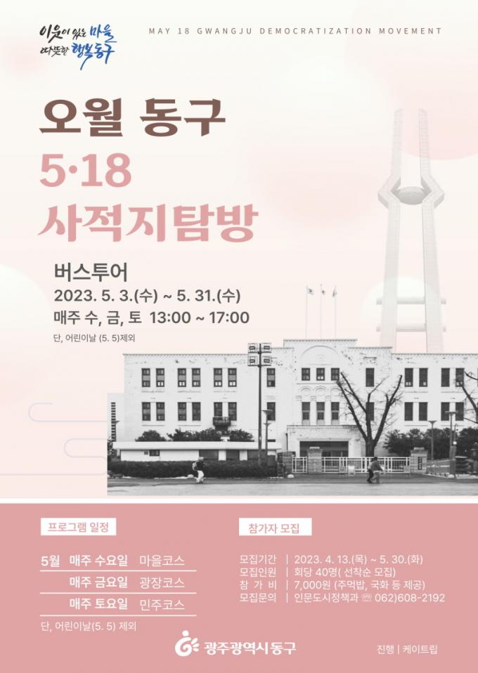 [È£³²´º½º¶óÀÎ = ¼ÀºÈ« ±âÀÚ] ±¤Áֽà µ¿±¸(ûÀå ÀÓÅÃ)´Â Á¦43ÁÖ³â 5¡¤18¹ÎÁÖȿ ±â³äÀÏÀ» ¾ÕµÎ°í 5¿ù ÇÑ ´Þ°£ ¡®¿À¿ù µ¿±¸ 5¡¤18 »çÀûÁö Ž¹æ¡¯ ÇÁ·Î±×·¥À» ¿î¿µÇÑ´Ù°í ¹àÇû´Ù.