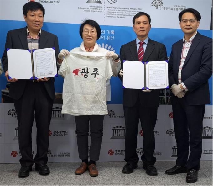 [È£³²´º½º¶óÀÎ = ¼ÀºÈ« ±âÀÚ] 5¡¤18¹ÎÁÖȿ±â·Ï°üÀº 5¡¤18 ´ç½Ã ¹Ì±¹¿¡¼ ±¤ÁÖÇ×Àï ¼Ò½ÄÀ» µè°í À̸¦ ÁöÁöÇϰí, Çлì±Ôź ½ÃÀ§¸¦ ÇÏ´ø Àç¹ÌÀ¯ÇлýµéÀÌ ÀÔÀº ¡®±¤ÁÖ Æ¼¼ÅÃ÷¡¯¸¦ ±âÁõ¹Þ¾Ò´Ù°í 27ÀÏ ¹àÇû´Ù.