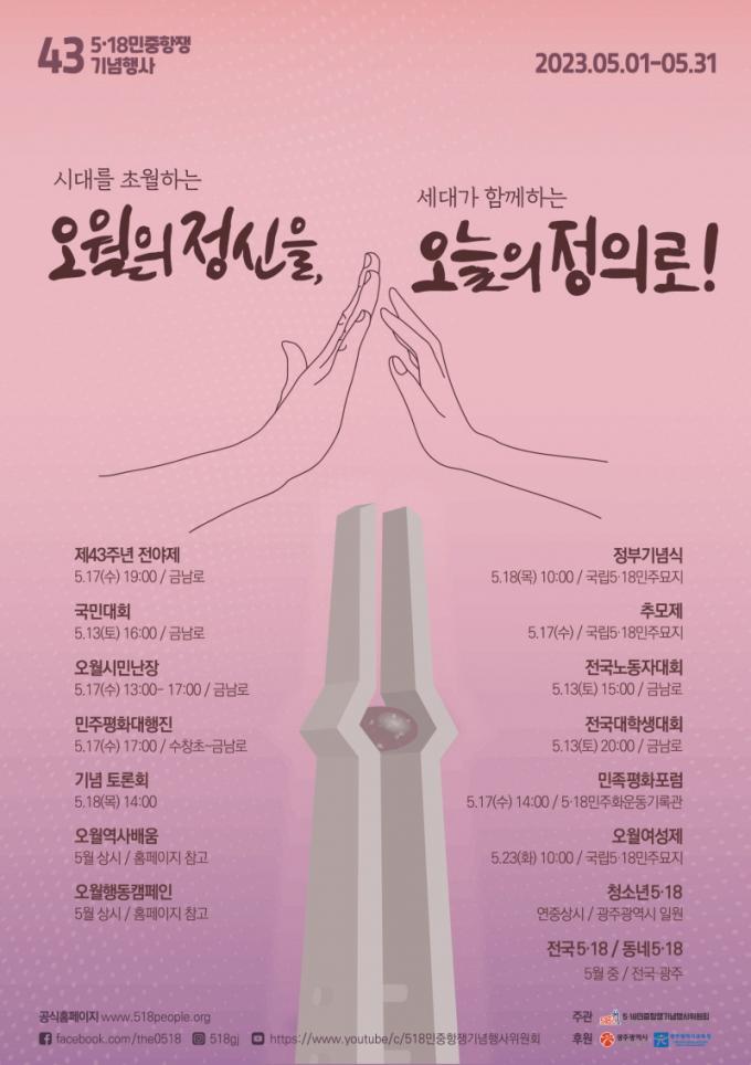 62°³ Âü°¡´Üü·Î ±¸¼ºµÈ ¡®Á¦43ÁÖ³â 5¡¤18¹ÎÁßÇ×Àï±â³äÇà»çÀ§¿øÈ¸¡¯(ÀÌÇÏ Çà»çÀ§)´Â Áö³ 3¿ù ½Ã¹Î °ø¸ð¸¦ ÅëÇØ ¡®¿À¿ùÀÇ Á¤½ÅÀ», ¿À´ÃÀÇ Á¤ÀÇ·Î!¡¯¸¦ ¿ÃÇØ ±â³äÇà»ç °ø½Ä±¸È£(½½·Î°Ç)·Î ¼±Á¤Çß´Ù.
