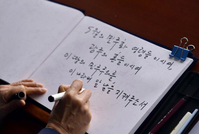 ±è Áö»ç¿Í ° ½ÃÀåÀº ±¹¸³5¡¤18¹ÎÁÖ¹¦Áö¿Í ¹ÎÁ·¹ÎÁÖ¿»ç¹¦¿ªÀ» Âü¹èÇϰí, 1980³â 5¡¤18¹ÎÁÖȿÀ¸·Î Çà¹æºÒ¸íµÈ Á¤±â¿µ ¿»ç¸¦ ºñ·ÔÇØ ÃÖ»óÇÊ¡¤±èÀ±½Ä¡¤¿À±Ô¸¸¡¤ÀÌÀç°ü ¿»ç µî °æ±âµµ Ãâ»ýÀÇ ¿À¿ù ¿µ·ÉÀ» Â÷·Ê·Î ã¾Æ ÇåÈÇß´Ù. ¾Õ¼ ±è Áö»ç´Â ¹æ¸í·Ï¿¡ ¡®5¿ùÀÇ ¹ÎÁÖÈ ¿µ·ÉµéÀ̽ÿ©, ±¤ÁÖÀÇ È¥µéÀ̽ÿ©, ÀÌ ¶¥ÀÇ ¹ÎÁÖÁÖÀǸ¦, ÀÌ ³ª¶óÀÇ ¾Õ³¯À» ÁöÄÑÁÖ¼Ò¼¡¯¶ó°í Àû¾ú´Ù.