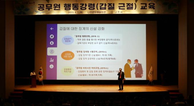 ³ªÁÖ½Ã(½ÃÀå À±º´ÅÂ)´Â 1ÀÏ ¹®È¿¹¼úȸ°ü¿¡¼ °ø¹«¿ø 500¿©¸íÀÌ Âü¼®ÇÑ °¡¿îµ¥ û·Å ºÐ¾ßÀÎ ¡®°©Áú ±ÙÀý¡¯ ±³À°À» Çß´Ù°í ¹àÇû´Ù.