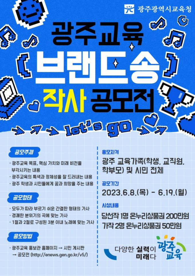ºê·£µå ¼ÛÀÇ °æ¿ì ±¤ÁÖ ±³À°°¡Á·(Çлý¡¤±³Á÷¿ø¡¤Çкθð) ¹× ½Ã¹Î ´ë»óÀ¸·Î °¡»ç °ø¸ð¸¦ ÁøÇàÇÑ´Ù. ÁÖÁ¦´Â ±¤ÁÖ±³À°ÀÇ Á¤Ã¼¼º°ú ¹Ì·¡ ºñÀü, ±¤ÁÖ Çлýµé¿¡°Ô ²Þ°ú Èñ¸ÁÀ» ÁÖ´Â ³»¿ëÀ¸·Î ¼³Á¤Çß´Ù. °ø¸ð ±â°£Àº 8~19ÀÏÀ̸ç, ÃÖÁ¾ ´ç¼±ÀÛ 1¸í, °¡ÀÛ 2¸íÀ» ¼±Á¤ÇÑ´Ù. ´ç¼±ÀÛÀ» ¹ÙÅÁÀ¸·Î Àü¹®°¡¿¡°Ô ÀÛ°îÀ» ÀÇ·ÚÇÏ°í °ËÅä ¹× È®Á¤À» ¸¶Ä£ ÈÄ È°¿ëÀ» ¾È³»ÇÒ °èȹÀÌ´Ù.