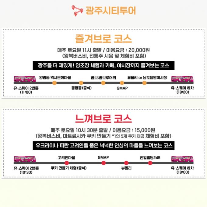ÇÑÆí Á¦14ȸ ±¤ÁÖºñ¿£³¯·¹ °³ÃÖ¿Í ¹ß¸ÂÃç ¿îÇà ÁßÀÎ ½ÃƼÅõ¾î ¹ö½º(¼øÈ¯Çü)´Â 7¿ù 9ÀϱîÁö ¸ÅÁÖ È¿äÀϺÎÅÍ ÀÏ¿äÀϱîÁö 1ÀÏ 9ȸ 1½Ã°£ ¹èÂ÷°£°ÝÀ¸·Î ¿îÇàµÈ´Ù. ¼ÛÁ¤¿ªÀ» ±âÁ¡À¸·Î À¯½ºÄù¾îÅ͹̳Î, »ó¹«Áö±¸ µî ÁÖ¿ä °ÅÁ¡Áö¸¦ ºñ·ÔÇØ ºñ¿£³¯·¹Àü½Ã°ü, ÆÄºô¸®¿Â Àü½Ã°ü(¾ç¸²µ¿ ÀÏ´ë)À» °æÀ¯ÇÏ´Â ÄÚ½º·Î ±¸¼ºµÅ ÀÖ´Ù.