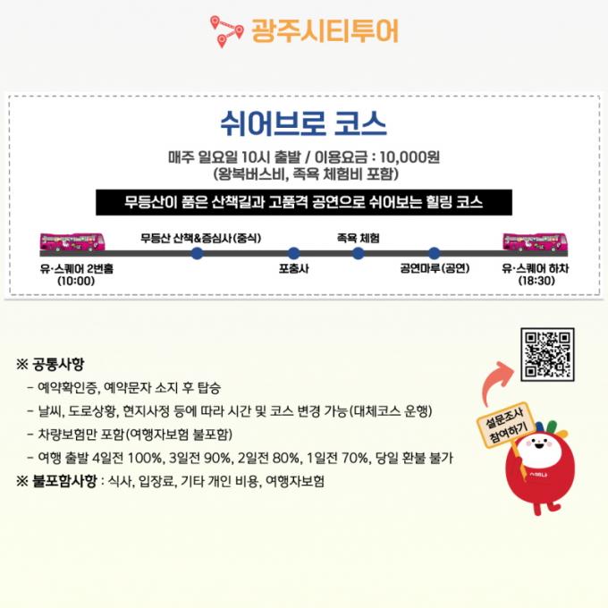 ¿À´Â 17ÀϺÎÅÍ º»°Ý ¿îÇàÇÏ´Â Å׸¶Çü ½ÃƼÅõ¾î¹ö½º´Â ¡®½¬¾îºê·Î(ÀÚ¿¬Èú¸µ+¹Ì½Ä)¡¯, ¡®Áñ°Üºê·Î(¹Ì½Ä+MZ´ÏÁî°áÇÕ)¡¯, ¡®´À²¸ºê·Î(°¡Á·+Àü½Ã)¡¯ µî 3ÄÚ½º·Î ±¸¼ºµÆÀ¸¸ç, ¸ÅÁÖ Å䡤ÀÏ¿äÀÏ ¿îÇàÇÑ´Ù. ÀÚ¿¬Èú¸µ°ú ¹Ì½ÄÀ» ÁÖÁ¦·Î ÇÑ ¡®½¬¾îºê·Î¡¯´Â Áõ½É»ç¿Í Æ÷Ãæ»ç, °ø¿¬¸¶·ç¸¦ ÀÕ´Â ÄÚ½º·Î, Èú¸µ°¡µçÈÞ¿¡¼ Á·¿åüÇèÀ» Áñ±æ ¼ö Àִ Ưº°ÇÔÀ» ´õÇß´Ù.