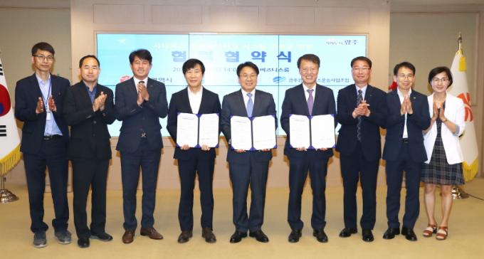 ±¤Áֽô À̸¦ À§ÇØ 20ÀÏ ¿ÀÈÄ ½Ãû ºñÁî´Ï½º·ë¿¡¼ °±âÁ¤ ±¤ÁÖ±¤¿ª½ÃÀå°ú ±Ç¿ëº¹ Çѱ¹±³Åë¾ÈÀü°ø´Ü ÀÌ»çÀå, ÀÓµ¿Ãá ±¤Áֽùö½º¿î¼Û»ç¾÷Á¶ÇÕ ÀÌ»çÀåÀÌ Âü¼®ÇÑ °¡¿îµ¥ ¡®½Ã³»¹ö½º ¾ÈÀü¸ð´ÏÅ͸µ ½Ã½ºÅÛ ±¸Ãà ¾÷¹«Çù¾à¡¯À» ü°áÇÏ°í ¹Î¡¤°ü Çù¾÷À¸·Î »ç¾÷À» ÃßÁøÇÑ´Ù.
