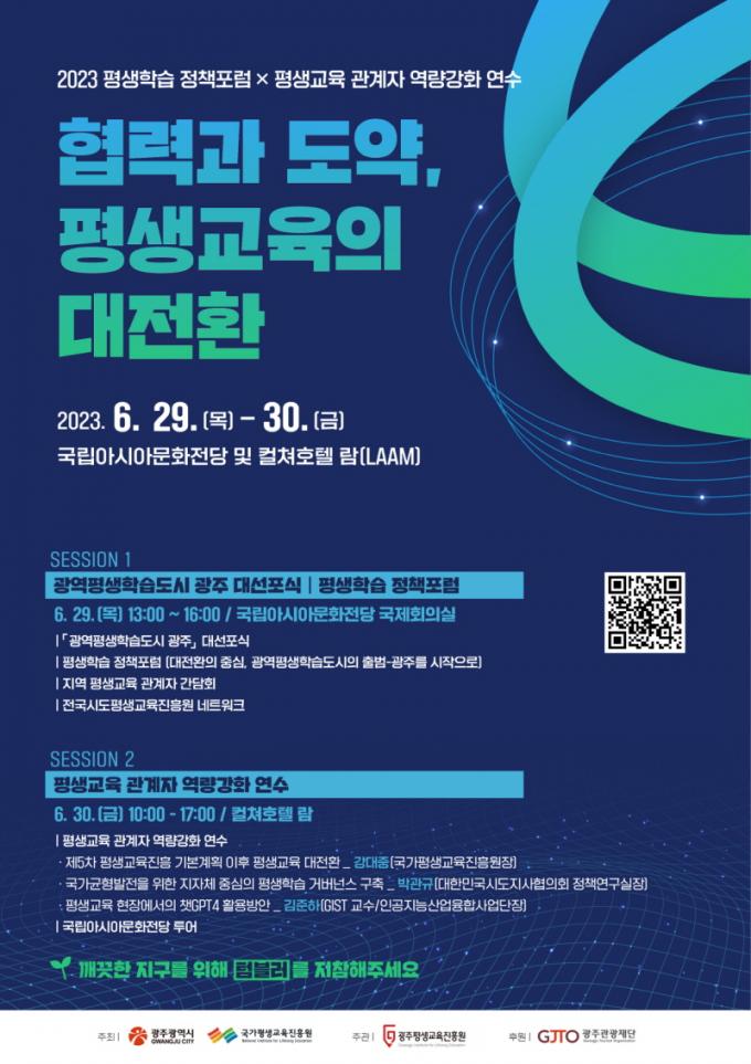±¤ÁÖ±¤¿ª½Ã(½ÃÀå °±âÁ¤)´Â 29~30ÀÏ ¡®2023 Æò»ýÇнÀ Á¤Ã¥Æ÷·³¡¯°ú ¡®Æò»ý±³À° °ü°èÀÚ ¿ª·®°È ¿¬¼ö¡¯¸¦ °³ÃÖÇϰí, Àü±¹ ÃÖÃÊ ±¤¿ªÆò»ýÇнÀµµ½Ã ¼±Æ÷¿Í ÇÔ²² Çù·Â¡¤µµ¾àÀ» À§ÇÑ Æò»ýÇнÀ Á¤Ã¥¹æ¾ÈÀ» ³íÀÇÇÑ´Ù.
