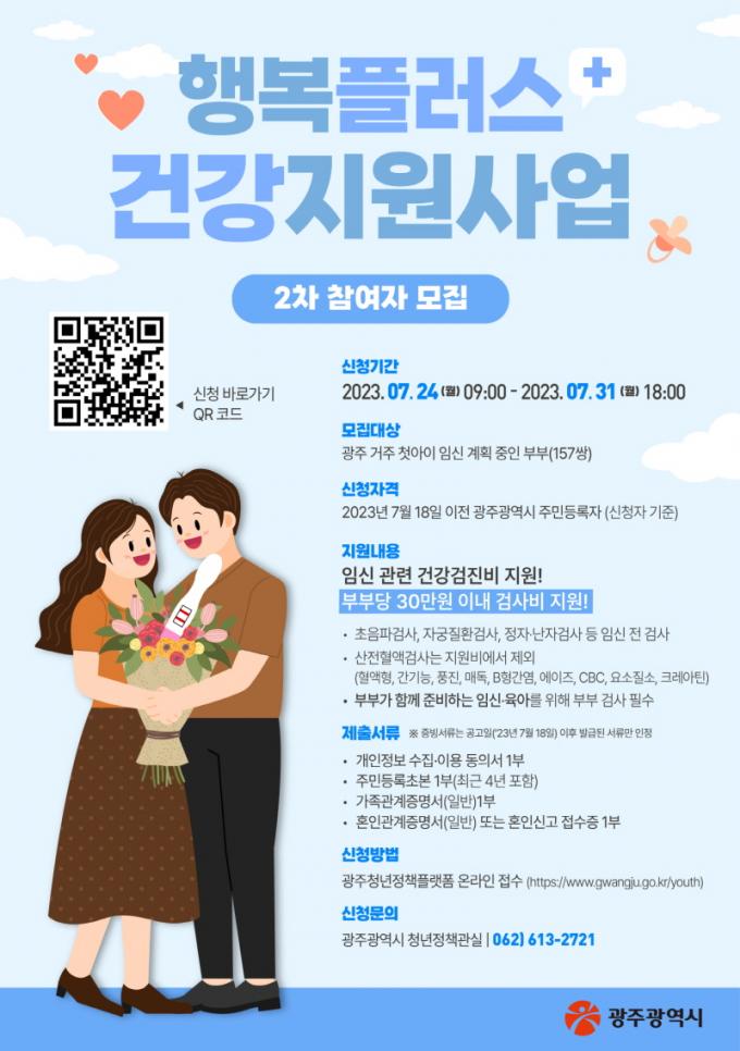 ½Åû´ë»óÀº º»ÀÎ ¶Ç´Â ¹è¿ìÀÚ°¡ °ø°íÀÏ ±âÁØ ±¤ÁÖ±¤¿ª½Ã¿¡ Áֹεî·ÏÀÌ µÅÀÖ°í, ù ¾ÆÀÌ ÀÓ½ÅÀ» Áغñ ÁßÀÎ ¹ýÀû ºÎºÎÀÌ´Ù. ´Ü ±âÁ¸¿¡ Áö¿ø¹ÞÀº ºÎºÎ, ù ¾ÆÀ̰¡ ¾Æ´Ñ ÀӽŠÁغñ ÁßÀÎ ºÎºÎ, ÇöÀç ÀӽŠÁßÀÎ ºÎºÎ´Â Á¦¿ÜµÈ´Ù. ½Åû(ºÎºÎ Áß ±¤ÁÖ °ÅÁÖ 1ÀÎÀÌ ½Åû °¡´É)Àº ±¤ÁÖû³âÁ¤Ã¥Ç÷§Æû(https://www.gwangju.go.kr/youth/)¿¡¼ ¿Â¶óÀÎÀ¸·Î ÇÒ ¼ö ÀÖÀ¸¸ç, È¥ÀΡ¤°ÅÁֱⰣ µî Æò°¡Ç׸ñÀ» ½É»çÇØ ÃÖÁ¾ ¼±¹ßÇÑ´Ù.