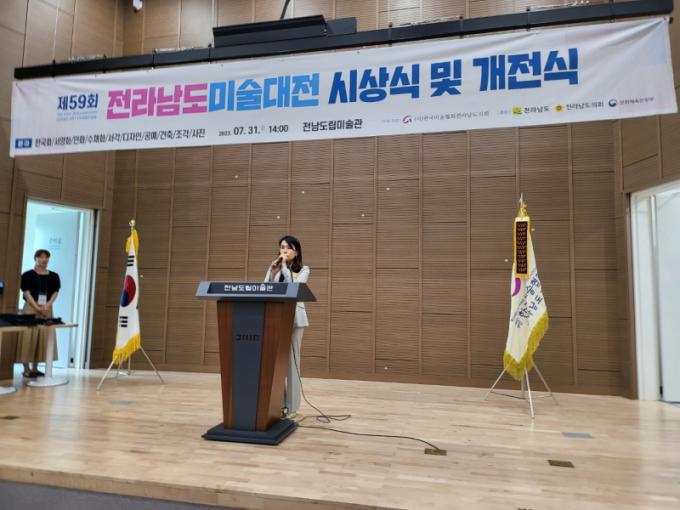 [È£³²´º½º¶óÀÎ = ¼ÀºÈ« ±âÀÚ] Àü³²µµÀÇȸ °æÁ¦°ü±¤¹®ÈÀ§¿øÈ¸ ÇѼ÷°æ ÀÇ¿ø(´õºÒ¾î¹ÎÁÖ´ç, ¼øÃµ7)ÀÌ Áö³´Þ 31ÀÏ Àü³²µµ¸³¹Ì¼ú°ü ´ë°´ç¿¡¼ °³ÃÖµÈ ¡®Á¦59ȸ Àü¶ó³²µµ¹Ì¼ú´ëÀü ½Ã»ó½Ä¡¯¿¡ Âü¼®ÇØ ¼ö»óÀÚ¸¦ ½Ã»óÇÏ°í °Ý·ÁÇß´Ù.