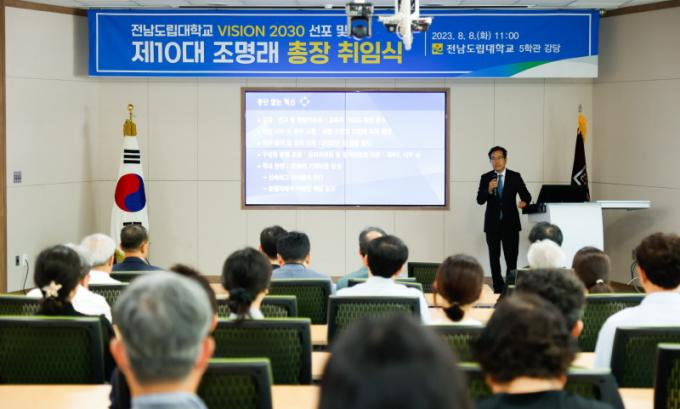 [È£³²´º½º¶óÀÎ = ¼ÀºÈ« ±âÀÚ] Àü³²µµ¸³´ëÇб³´Â Á¦10´ë Á¶¸í·¡ ÃÑÀåÀÌ 8ÀÏ ÃëÀÓ½ÄÀ» ¡®VISION 2030 Àü¶ó³²µµ Àü¹®»ê¾÷ÀηÂÀ» ¾ç¼ºÇÏ´Â Æò»ýÁ÷¾÷±³À° ´ëÇС¯ ºñÀü ¼±Æ÷½ÄÀ¸·Î ´ëóÇϰí, °ø½Ä ¾÷¹«¿¡ µé¾î°¬´Ù°í ¹àÇû´Ù.