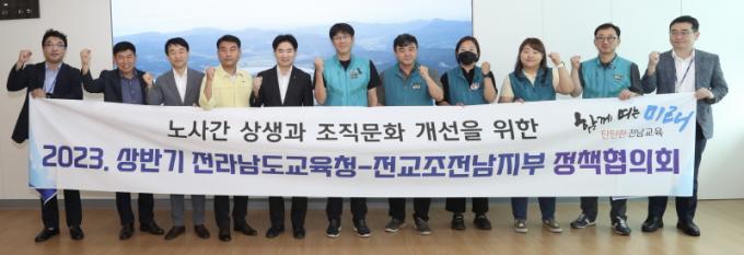 [È£³²´º½º¶óÀÎ = ¼ÀºÈ« ±âÀÚ] Àü¶ó³²µµ±³À°Ã»(±³À°°¨ ±è´ëÁß)°ú Àü±¹±³Á÷¿ø³ëµ¿Á¶ÇÕ Àü³²ÁöºÎ(ÁöºÎÀå ½Å¿Õ½Ä)°¡ 9ÀÏ(¼ö) Àü¶ó³²µµ±³À°Ã»¿¡¼ ¡®2023³â »ó¹Ý±â Á¤Ã¥ÇùÀÇȸ ü°á½Ä¡¯À» °¡Á³´Ù.
