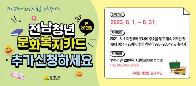 ¡®2023³â Àü³² û³â ¹®Èº¹ÁöÄ«µå Áö¿ø»ç¾÷¡¯Àº Àü¶ó³²µµ¿¡ °ÅÁÖÇϴ û³â(19¼¼~28¼¼)À» ´ë»óÀ¸·Î °ø¿¬ °ü¶÷, Çпø ¼ö°, µµ¼ ±¸¸Å µî ¹®Èº¹Áöºñ¸¦ ¿¬ 20¸¸ ¿ø Áö¿øÇÏ´Â »ç¾÷ÀÌ´Ù. ÇϹݱ⠽Åû ±â°£Àº 8¿ù 1ÀϺÎÅÍ 8¿ù 31ÀϱîÁöÀÌ´Ù. ½Åû ¹æ¹ýÀº ³óÇù Ä«µå ´©¸®ÁýÀ» ÅëÇØ ½ÅûÇϰųª, ½ÅûÀÚ Áֹεî·Ï»ó ÁÖ¼ÒÁö °üÇÒ À¾¡¤¸é Áֹμ¾ÅÍ¿¡ ¹æ¹® ½ÅûÇÏ¸é µÈ´Ù.